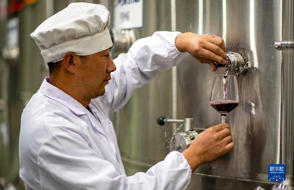 7月26日,桑日縣一家葡萄酒企業(yè)的釀酒師李曉平在發(fā)酵車(chē)間檢查酒樣。