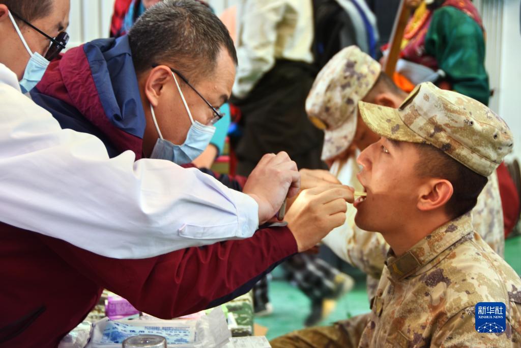 在西藏阿里地區,西安交通大學(xué)口腔醫院援藏醫生為解放軍戰士檢查牙齒(7月27日攝)。