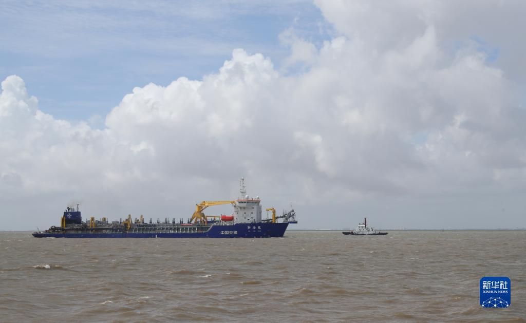 7月26日,在長(cháng)江口水域,一艘拖船(右)航行在中交上航局耙吸式疏浚挖泥船“新海鳳”輪旁。