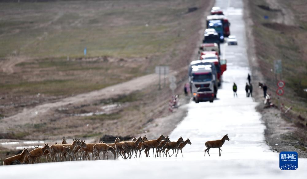7月28日,一群藏羚羊通過(guò)青藏公路前往三江源地區的棲息地。