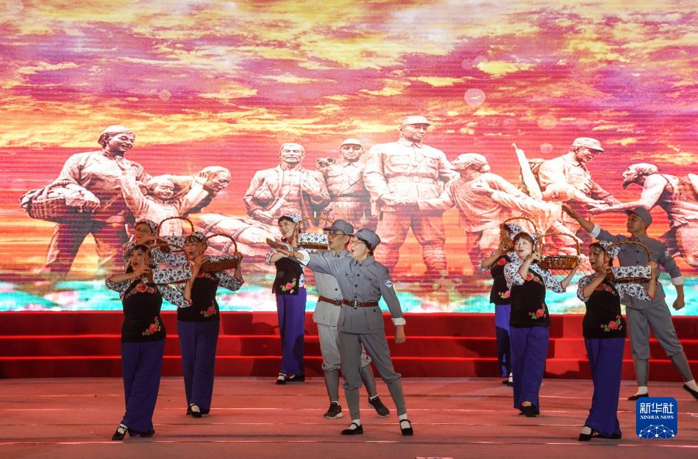老戰士后代組成的文工團在國防園慶祝八一建軍節演出中表演《黃橋燒餅歌》(7月26日攝)。