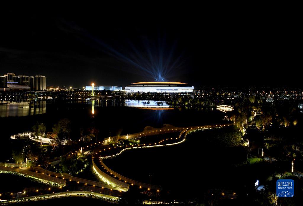 這是7月28日拍攝的開(kāi)幕式后的東安湖體育公園夜景。