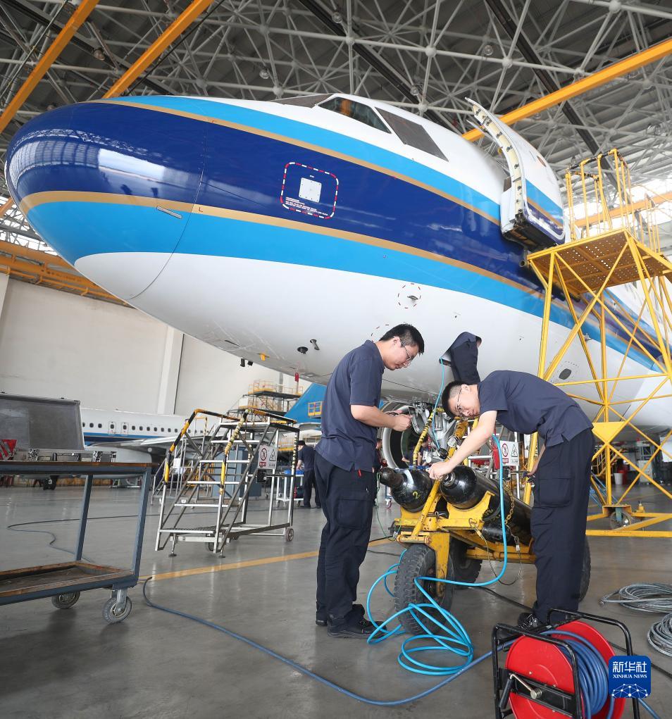 7月28日,工作人員在南航工程技術(shù)分公司沈陽(yáng)基地3號機庫進(jìn)行飛機維護。