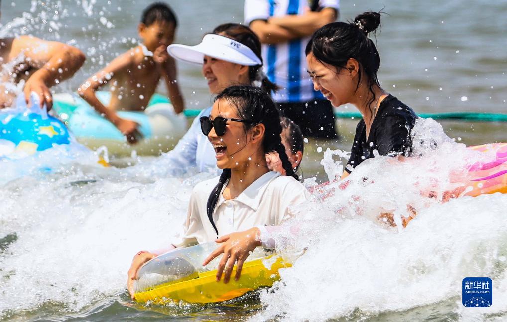 7月23日,游客在山東省威海市國際海水浴場(chǎng)戲水納涼。