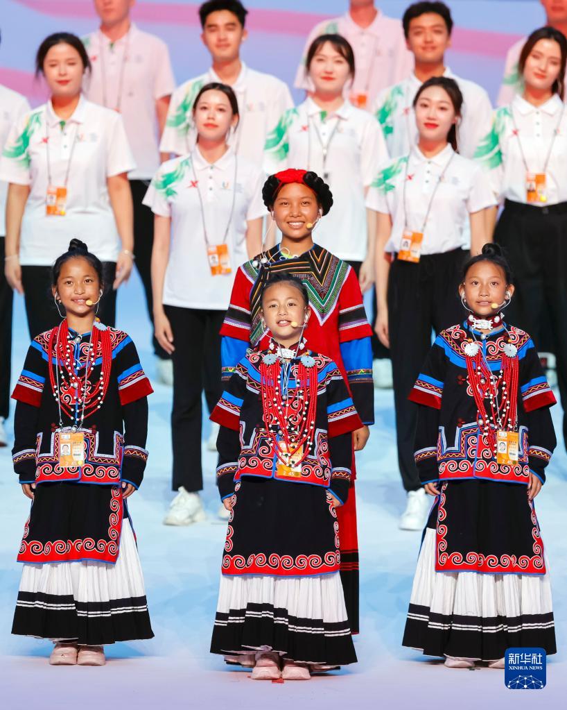 7月8日,俄地惹漢、馬杰英、吉合拉作(前排從左至右)和吉好有果(中)參加成都大運會(huì )開(kāi)幕式彩排。新華社記者 沈伯韓 攝