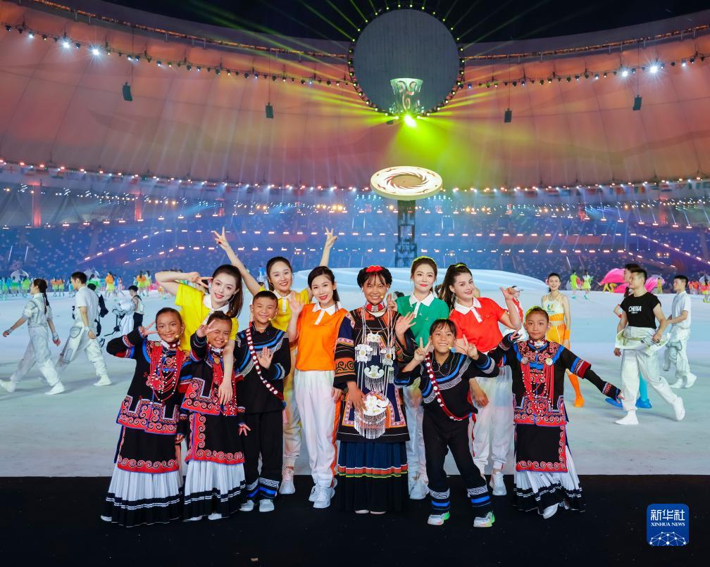 7月23日,成都大運會(huì )開(kāi)幕式彩排結束后,演員和來(lái)自大涼山的孩子們合影。新華社記者 沈伯韓 攝