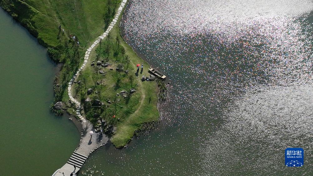 7月28日,游客在湖南省郴州市北湖區仰天湖大草原的湖邊游覽(無(wú)人機照片)。