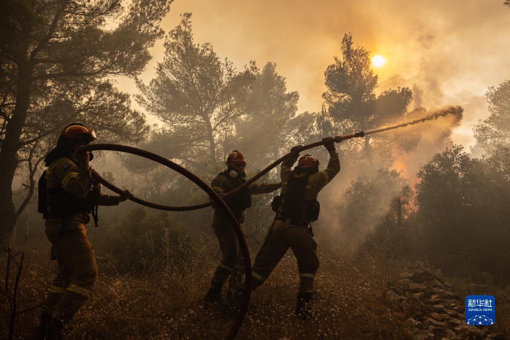 7月20日,在希臘雅典西郊的圣索蒂拉,消防員進(jìn)行滅火作業(yè)。