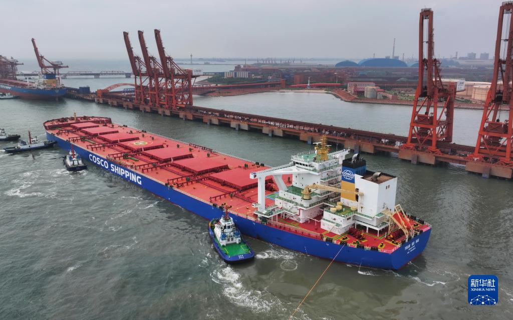 7月28日,滿(mǎn)載約40萬(wàn)噸巴西鐵礦石的“遠谷?!陛喸谕陷喌膮f(xié)助下向河北港口集團唐山港曹妃甸港區礦石碼頭靠泊(無(wú)人機照片)。