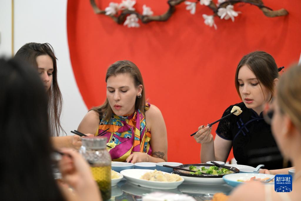 7月29日,參加夏令營(yíng)的來(lái)華學(xué)生在餐廳品嘗餃子。