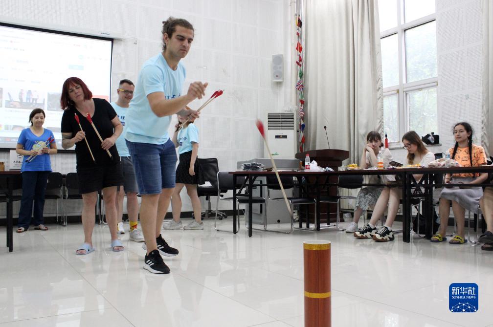 參加夏令營(yíng)的來(lái)華學(xué)生在天津理工大學(xué)體驗投壺游戲(7月21日攝)。