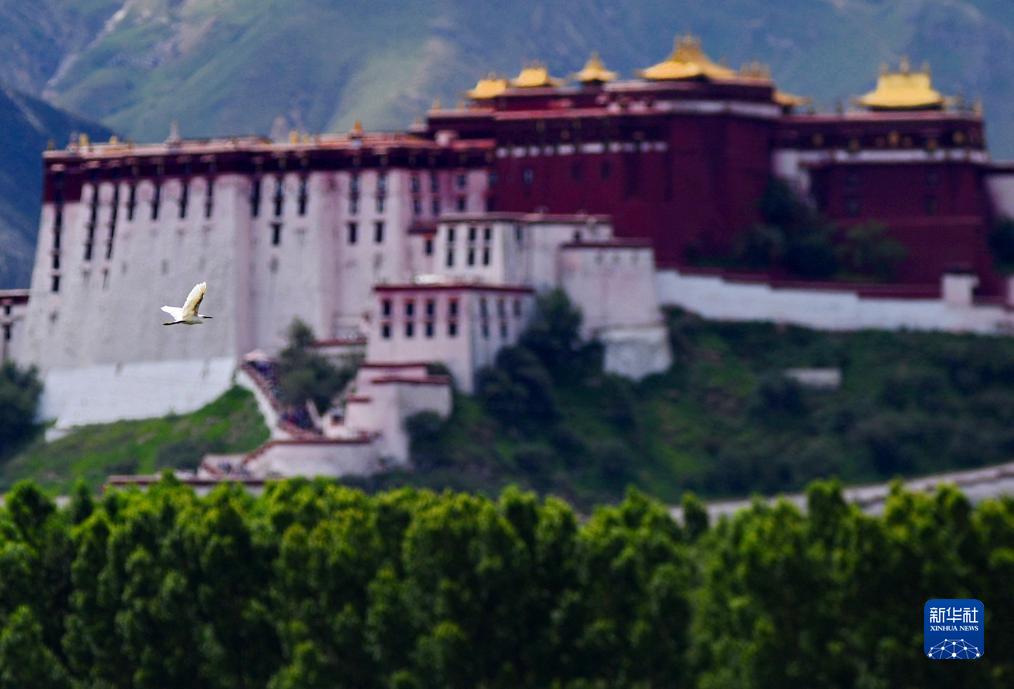 白鷺在拉魯濕地上空盤(pán)旋(7月23日攝)。