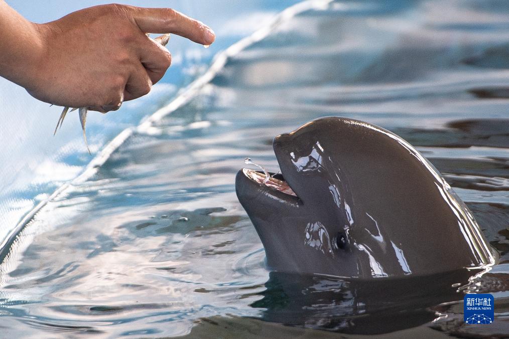7月5日,中國科學(xué)院水生生物研究所白鱀豚館訓練員給小江豚“F9C22”喂食。