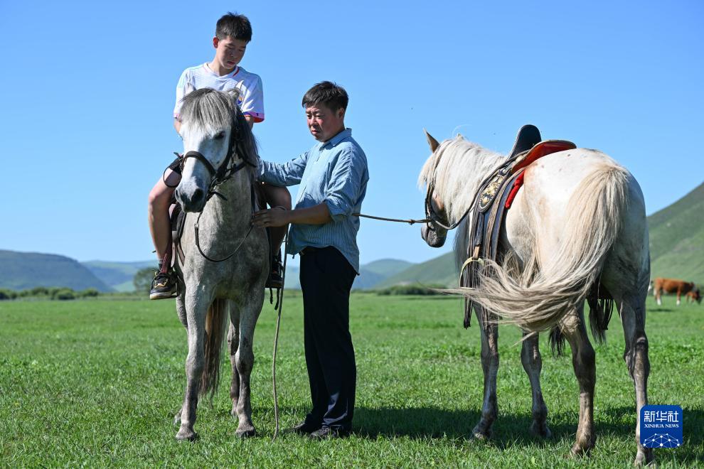 7月25日,吳蘇道(右)在草場(chǎng)上為吳蘇日力格調整馬鞍。