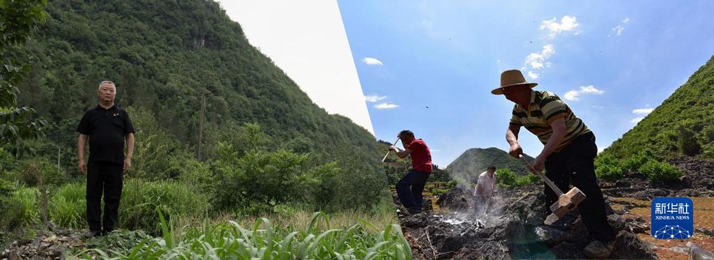 這是一張拼版照片:右圖為2008年劉登榮帶領(lǐng)村民一起改造石漠化土地的資料照片(西疇縣融媒體中心供圖);左圖為2023年7月27日,劉登榮站在改造好的臺地上留影(新華社記者費茂華攝)。新華社發(fā)