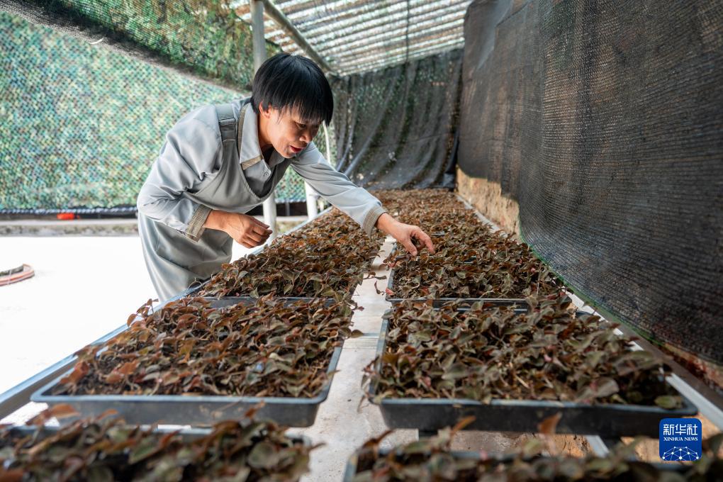 謝成芬在家中搭建的大棚內打理人工種植的金線(xiàn)蓮植株(7月27日攝)。新華社記者 陳欣波 攝