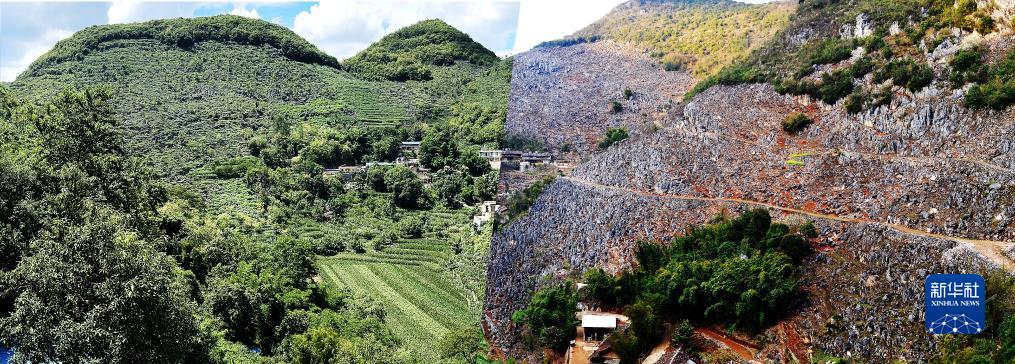 這是一張拼版照片:右圖為1991年拍攝的西疇縣大鄔麻村改造前的石漠化情況(西疇縣融媒體中心供圖);左圖為2023年7月26日拍攝的西疇縣大鄔麻村改造后的情況(新華社記者費茂華攝)。新華社發(fā)