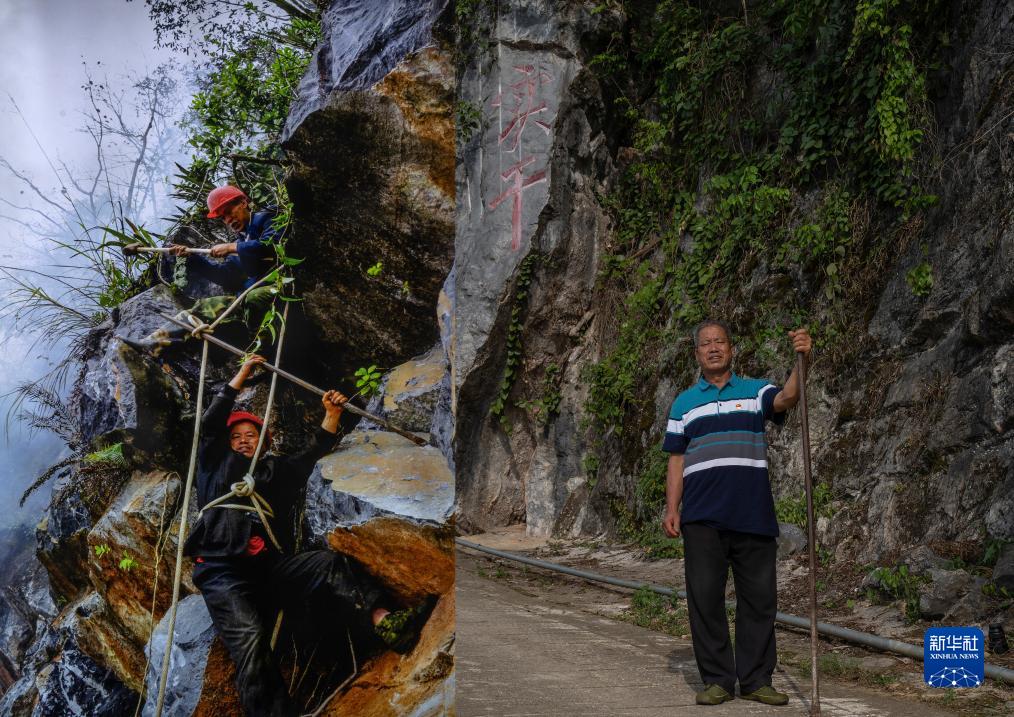 這是一張拼版照片:左圖為2008年李華明(下)和同伴在修路時(shí)在懸崖上打炮眼的資料照片(西疇縣融媒體中心供圖);右圖為2023年7月26日李華明在修好的出村路上留影(新華社記者費茂華攝)。新華社發(fā)