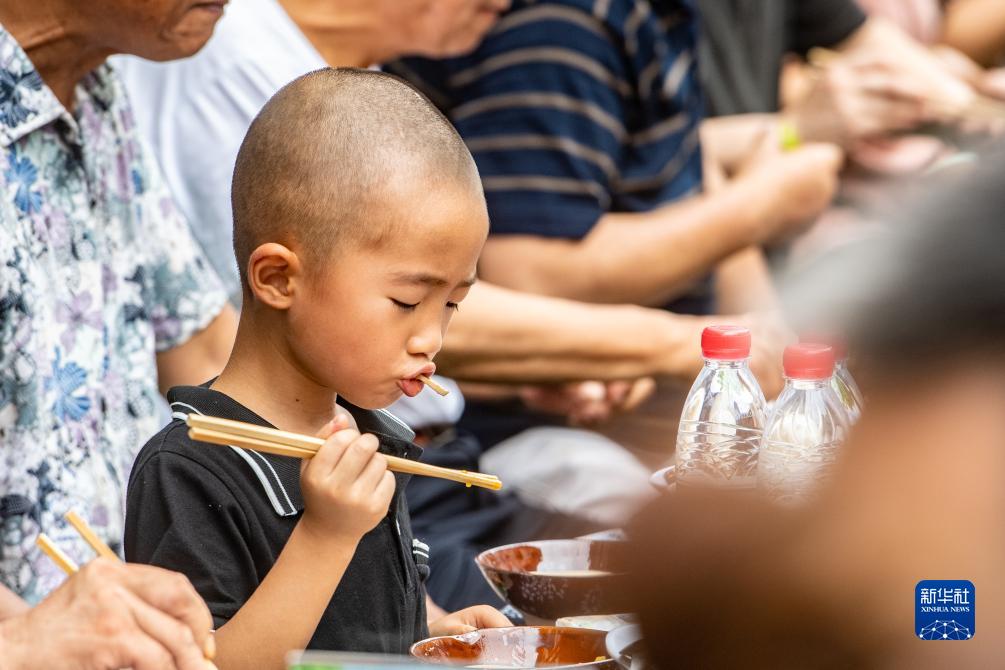 7月29日,在重慶市綦江區安穩鎮,小朋友在“苗家伏羊節”上吃長(cháng)桌宴。