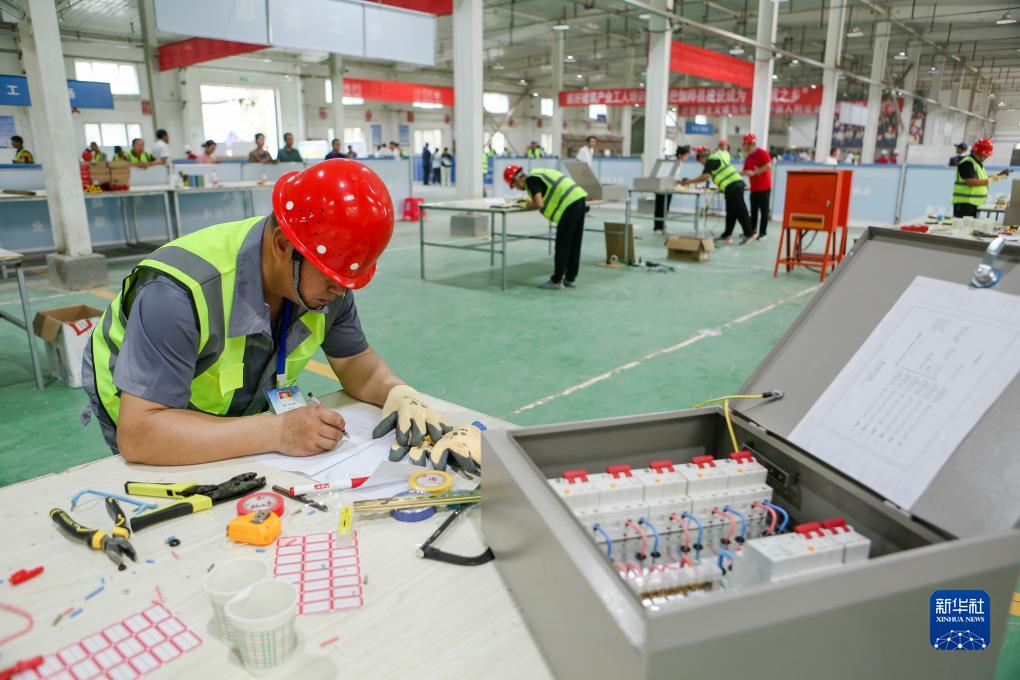 7月29日,在第二屆新疆建筑工匠技能大賽決賽現場(chǎng),參賽選手在進(jìn)行電工項目競賽。