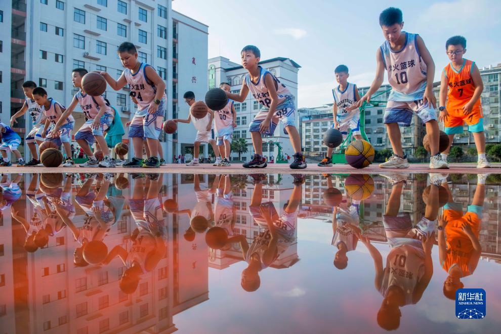 7月29日,孩子們在湖南省永州市道縣一籃球訓練營(yíng)進(jìn)行籃球訓練。
