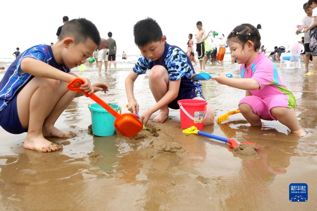7月29日,小朋友們在江蘇省連云港市連島景區大沙灣海濱浴場(chǎng)沙灘上玩沙子。