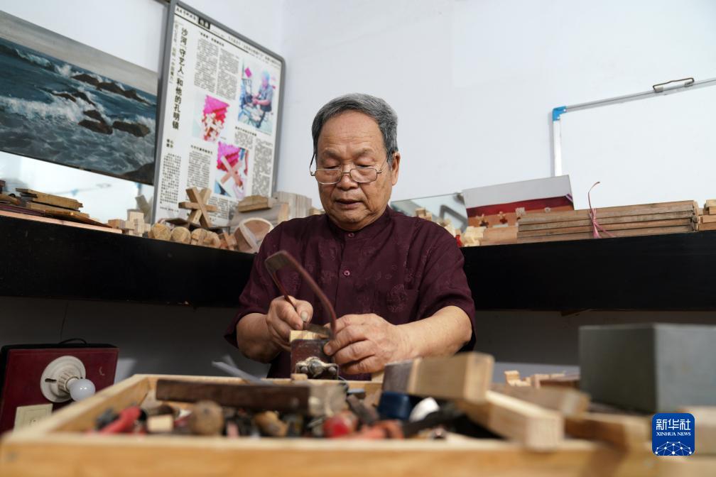 7月30日,侯全辰在工作間內制作孔明鎖。