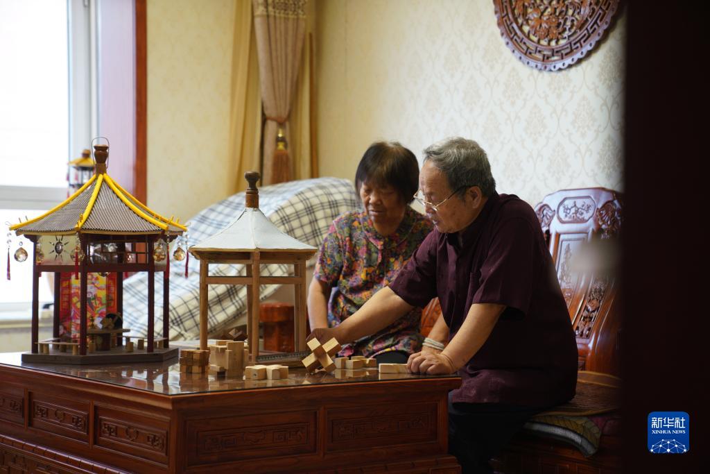 7月30日,侯全辰(右)在家中和妻子研究孔明鎖制作。