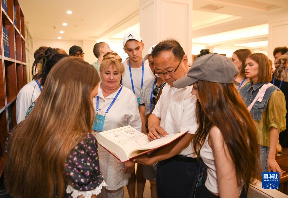 一名工作人員(前右二)在新疆圖書(shū)館向前來(lái)參觀(guān)的國外舞蹈團展示、講解《永樂(lè )大典》的篇章(7月23日攝)。
