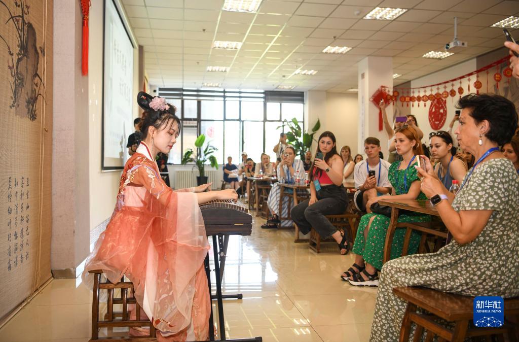 烏魯木齊古箏愛(ài)好者在新疆圖書(shū)館為外國歌舞團演員演奏《漁舟唱晚》(7月23日攝)。