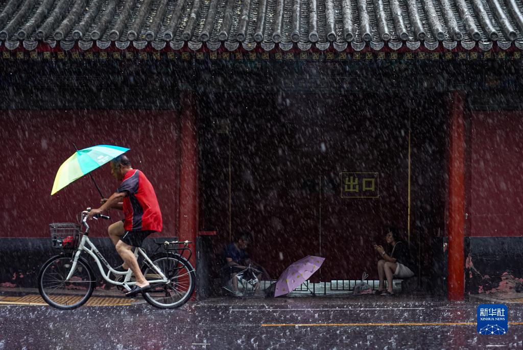 7月30日,市民在北京雍和宮大街冒雨騎行。