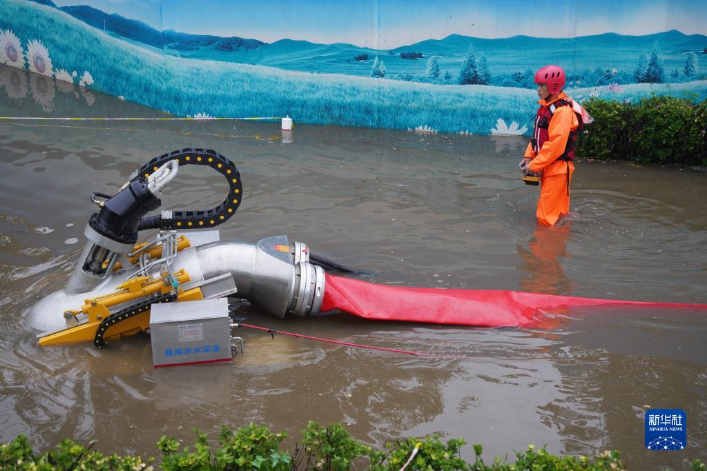 7月30日,河北省邢臺市內丘縣消防救援大隊消防員操控排澇機器人進(jìn)行排水作業(yè)。