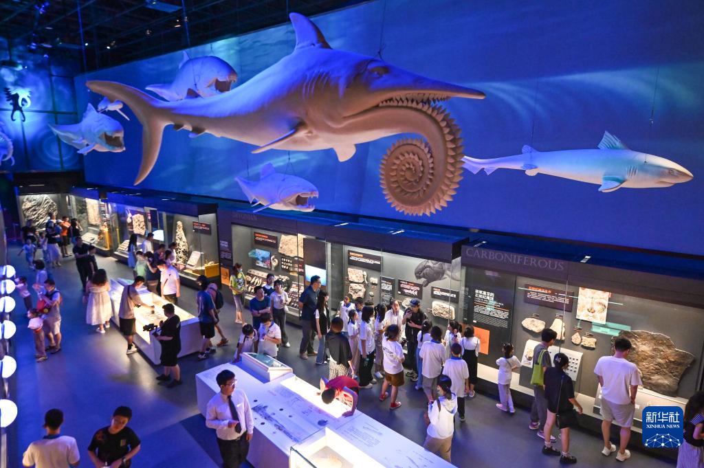 7月29日,在國家海洋博物館,學(xué)生們在“遠古海洋”展廳內參觀(guān)。