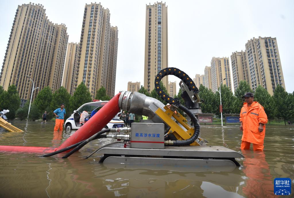 7月31日,在河北省石家莊市裕華路一處積水路段,工作人員進(jìn)行緊急排水。
