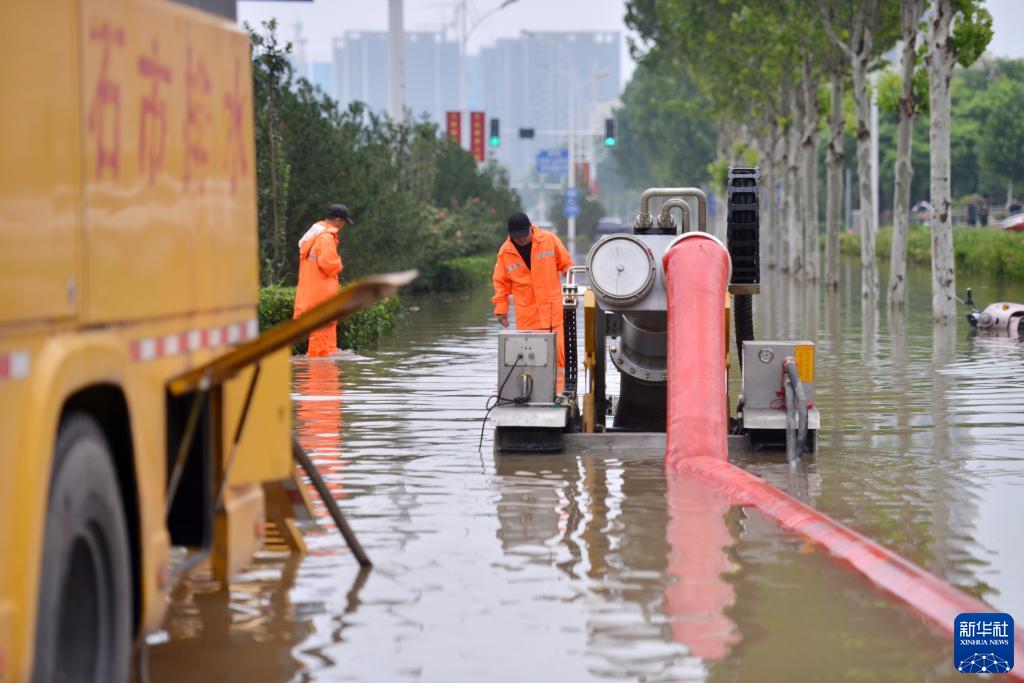 7月31日,在河北省石家莊市天山北大街一積水路段,工作人員進(jìn)行緊急排水。