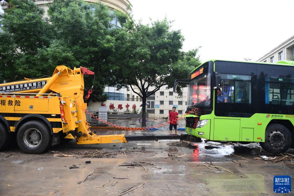 7月31日,搶險人員在北京市門(mén)頭溝區新橋大街救援拋錨的公交車(chē)。