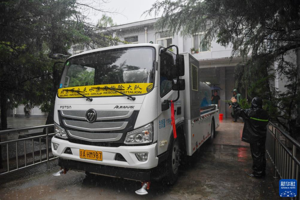 7月31日,在北京市門(mén)頭溝區,一輛北京市自來(lái)水集團的水車(chē)為因強降雨停水的一處療養院供水。