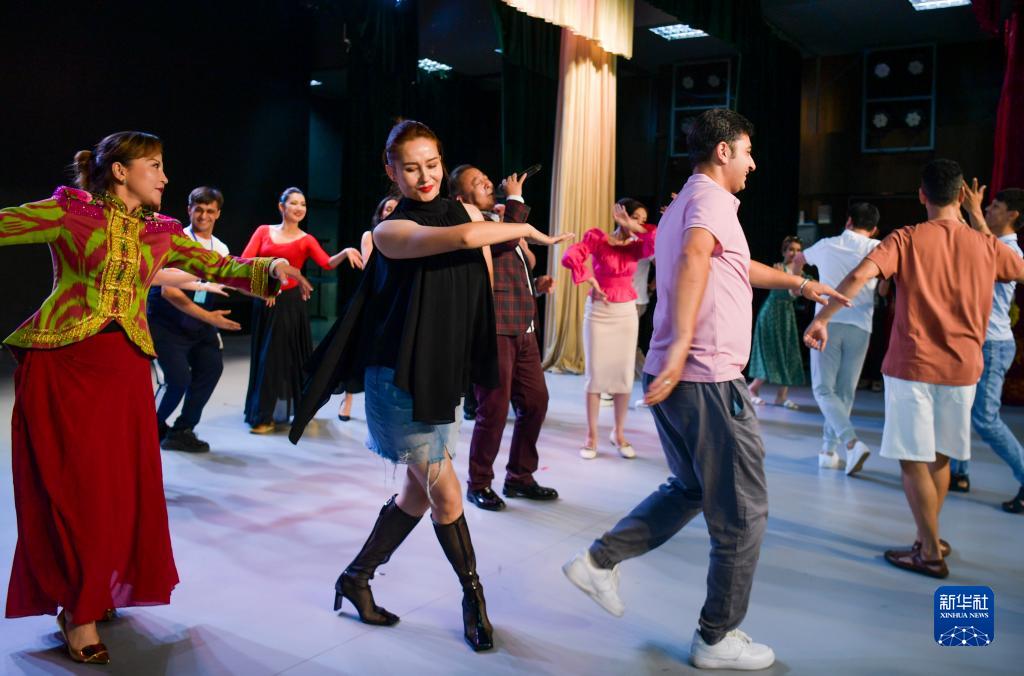 7月31日,在新疆藝術(shù)劇院,塔吉克斯坦羅拉國家功勛歌舞團與新疆藝術(shù)劇院的演員一起載歌載舞。