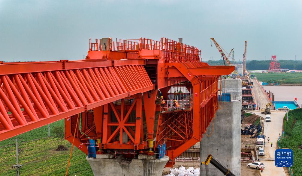7月31日拍攝的雄商高鐵黃河特大橋主橋施工現場(chǎng)(無(wú)人機照片)。