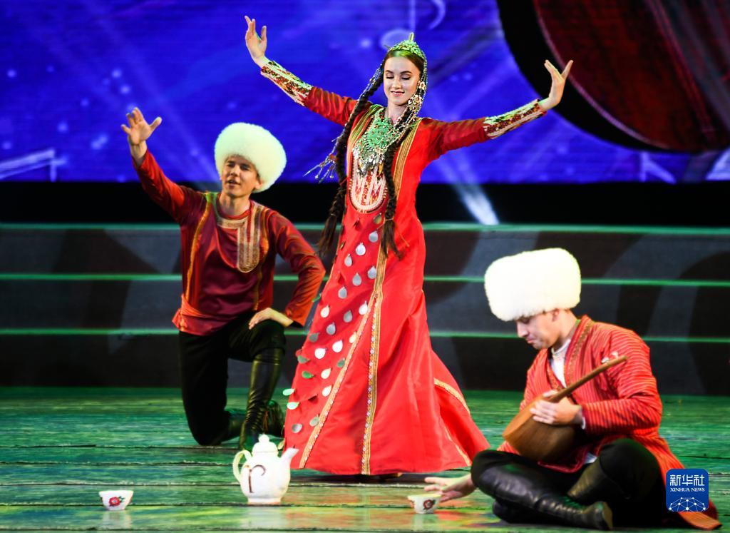 7月31日晚,在新疆人民劇場(chǎng),土庫曼斯坦國家舞蹈團演員在演出。