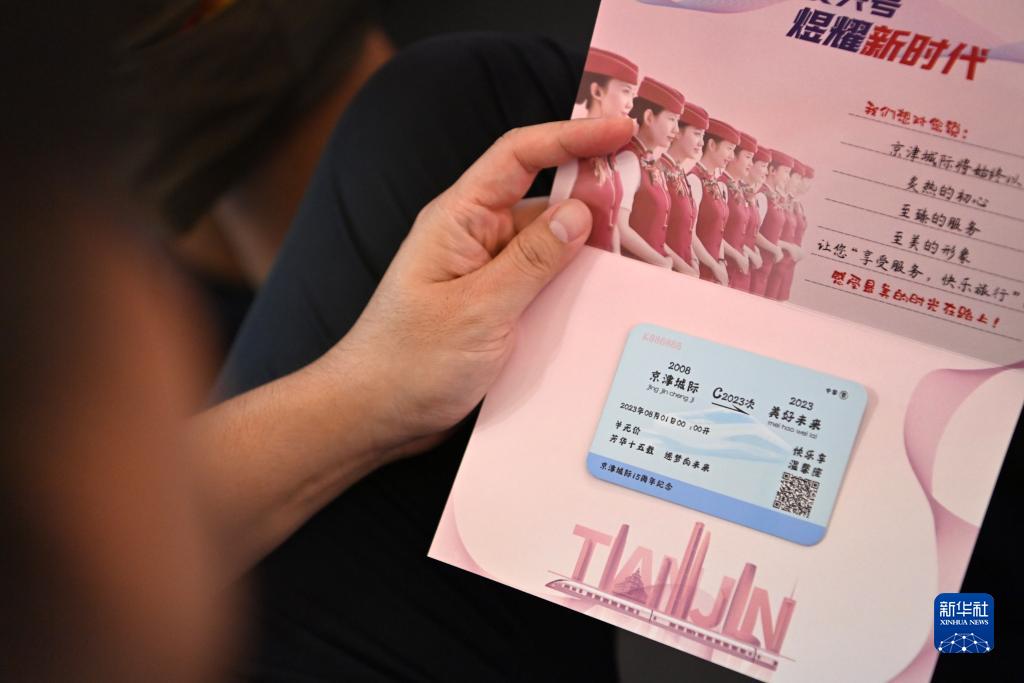 8月1日,乘坐京津城際列車(chē)的旅客在查看紀念冊。