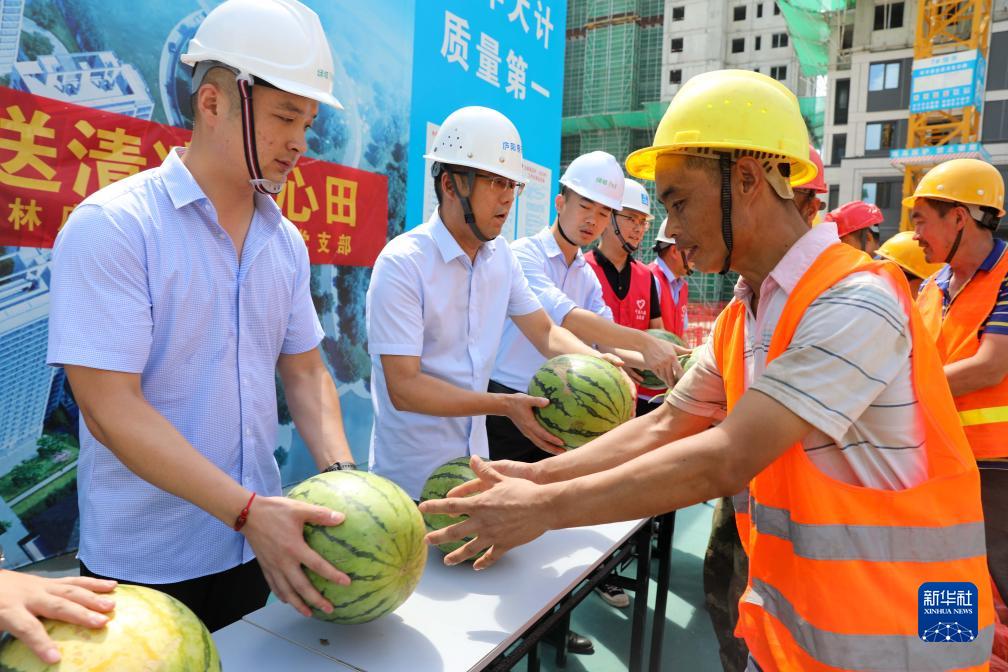 8月1日,中建二局合肥林店家園安置房項目部為工友發(fā)放西瓜。