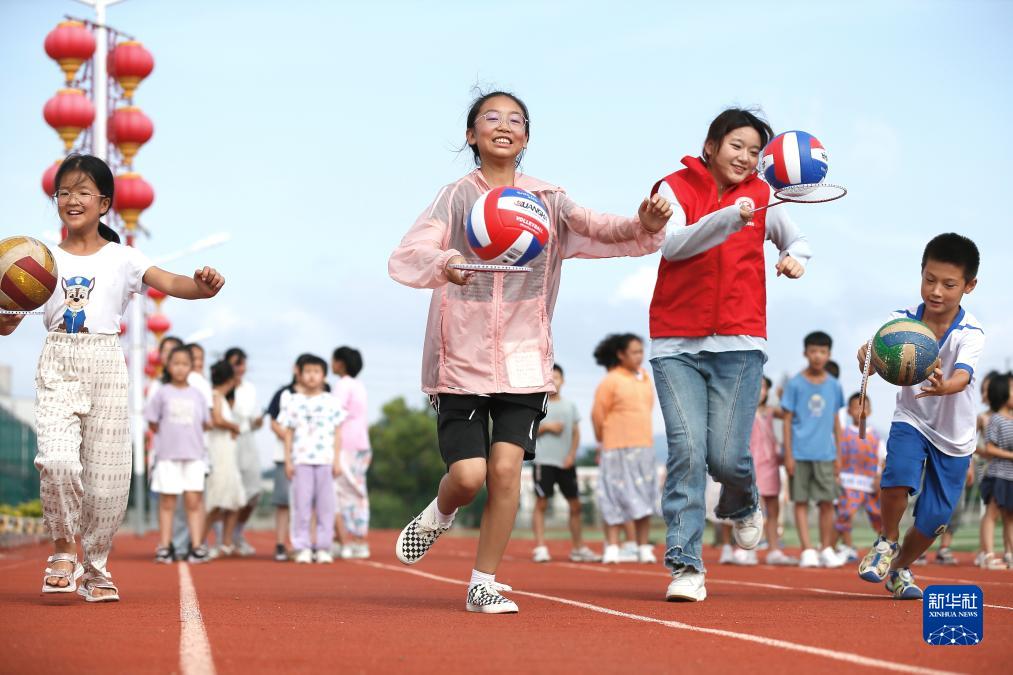 8月1日,在即墨區龍山街道前東葛村新時(shí)代文明實(shí)踐站,大學(xué)生志愿者與學(xué)生們一起玩“托球跑”游戲。