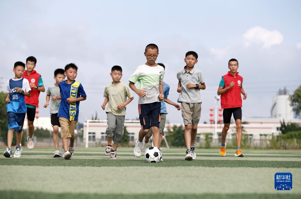 8月1日,在即墨區龍山街道前東葛村新時(shí)代文明實(shí)踐站,大學(xué)生志愿者與孩子們一起踢足球。
