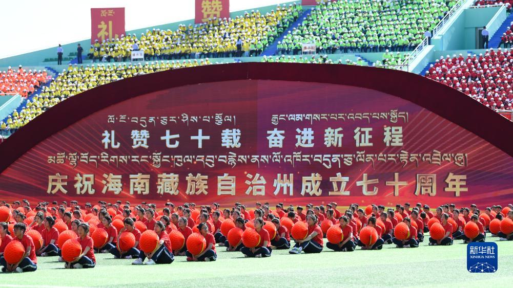 當日,青海省海南藏族自治州舉行慶祝成立70周年大會(huì )。海南州民族體育場(chǎng)彩旗飄飄,歌聲悠揚,各族群眾身著(zhù)盛裝,滿(mǎn)懷喜悅。