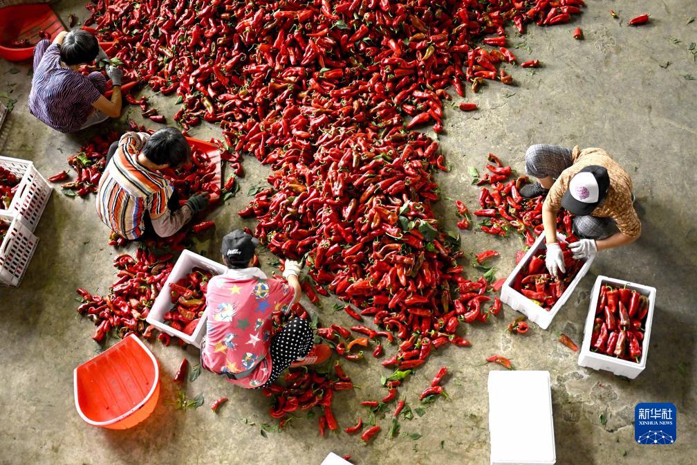 8月2日,安徽省蚌埠市五河縣朱頂鎮陳臺村村民在分揀辣椒。