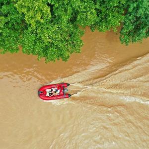 8月2日,救援人員在河北省涿州市市區乘坐沖鋒舟前去轉移受災群眾(無(wú)人機照片)。