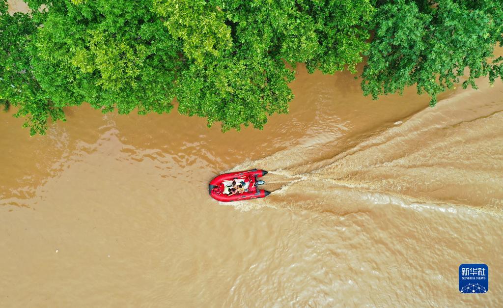 8月2日,救援人員在河北省涿州市市區內轉移群眾(無(wú)人機照片)。