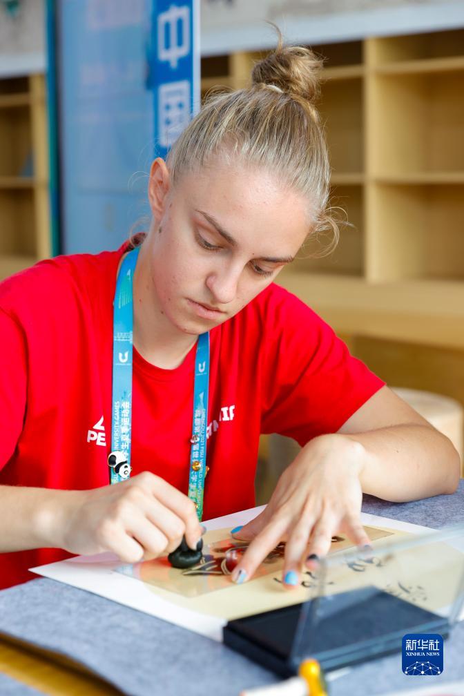 7月31日,在成都大運村的“漢語(yǔ)橋”中文學(xué)習互動(dòng)體驗區,羅馬尼亞運動(dòng)員斯特凡妮婭-帕特里夏·克蒂內安通過(guò)拓印的方式感受中國漢字的魅力。