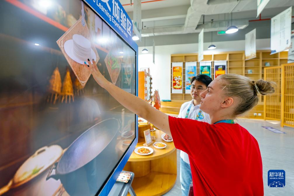 7月31日,在成都大運村的“漢語(yǔ)橋”中文學(xué)習互動(dòng)體驗區,羅馬尼亞運動(dòng)員斯特凡妮婭-帕特里夏·克蒂內安通過(guò)數字互動(dòng)電子屏學(xué)習做中國菜。